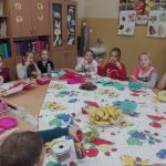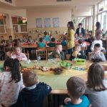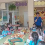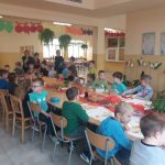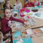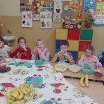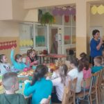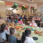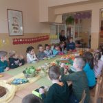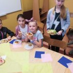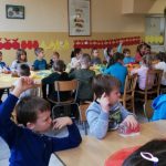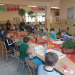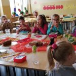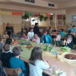 Ósmego listopada wszyscy uczniowie klas pierwszych zostali zaproszeni przez wychowawców i dzieci ze świetlicy szkolnej na uroczyste zdrowe śniadanie do stołówki szkolnej. Przy pięknie nakrytych stołach ze zdrową żywnością uczniowie zjedli ze swoimi wychowawcami zdrowe kanapki, warzywa, owoce, sałatki przygotowane przez rodziców. Spotkanie było okazją do wspólnej rozmowy, zabawy i rozwiązywania zagadek o zdrowym odżywianiu. Wiedza dzieci na ten temat pozytywnie nas zaskoczyła, wykazały się znajomością nazw warzyw i owoców, nawet tych egzotycznych. Ważnym aspektem spotkania był także problem marnowania żywności, o którym informowała nas zrobiona wystawka. W czasie śniadania towarzyszyła nam muzyka – piosenki o zdrowym odżywianiu.