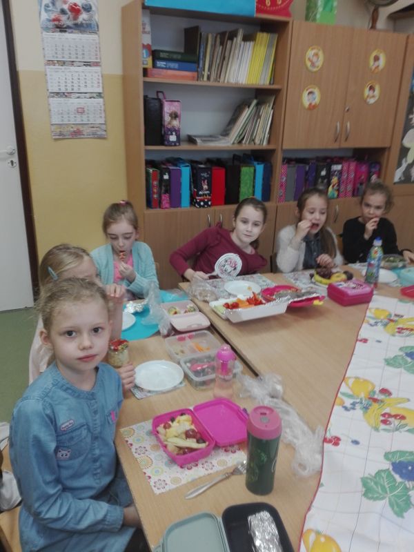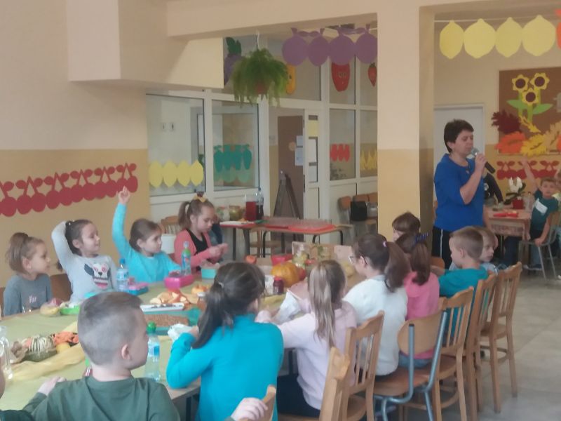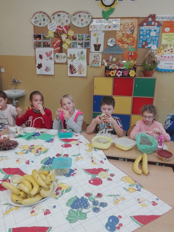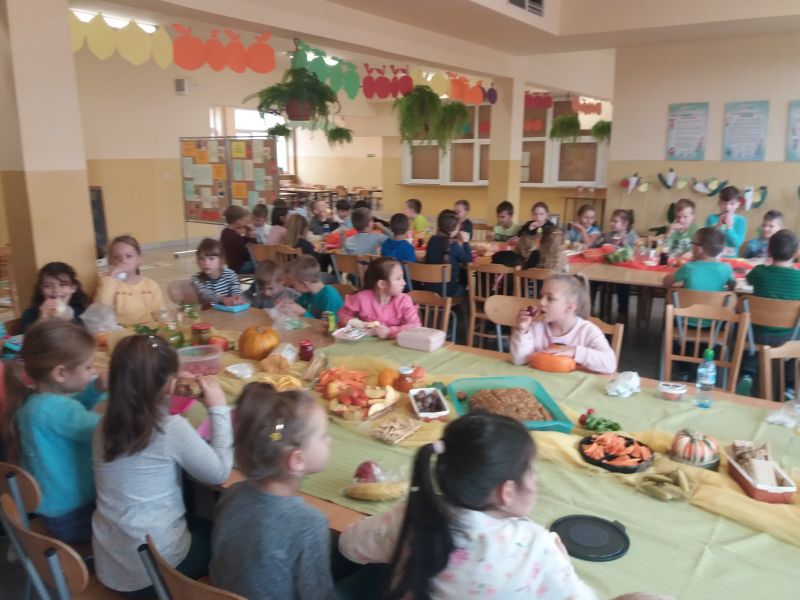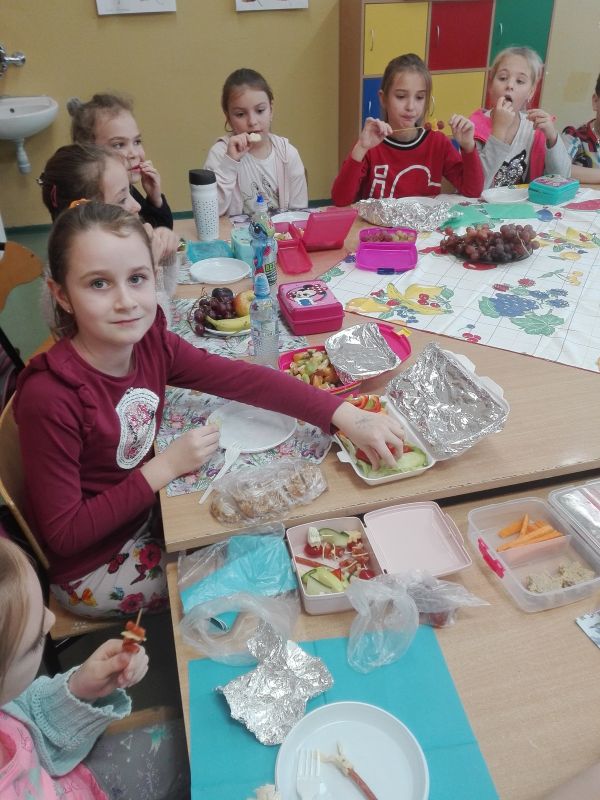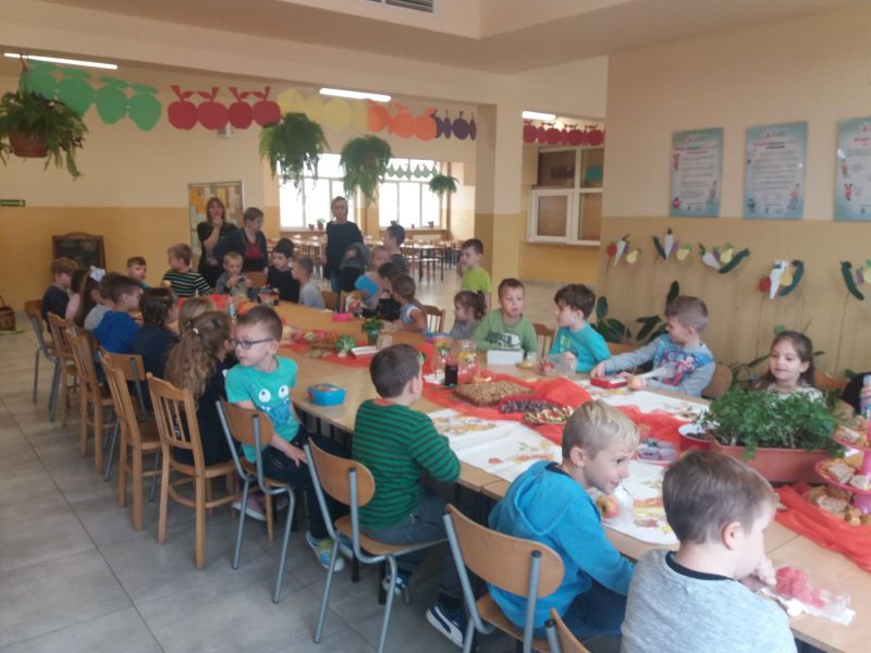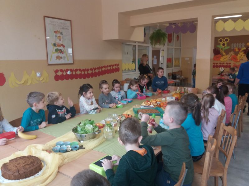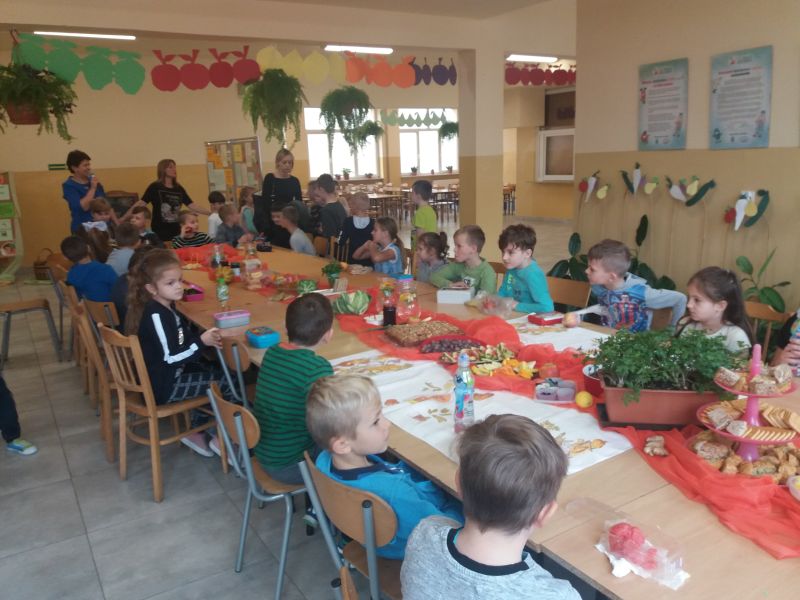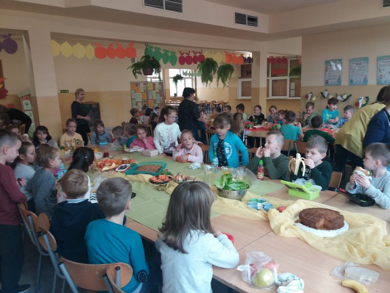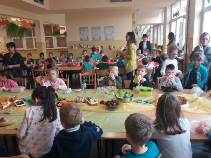 Ósmego listopada wszyscy uczniowie klas pierwszych zostali zaproszeni przez wychowawców i dzieci ze świetlicy szkolnej na uroczyste zdrowe śniadanie do stołówki szkolnej. Przy pięknie nakrytych stołach ze zdrową żywnością uczniowie zjedli ze swoimi wychowawcami zdrowe kanapki, warzywa, owoce, sałatki przygotowane przez rodziców. Spotkanie było okazją do wspólnej rozmowy, zabawy i rozwiązywania zagadek o zdrowym odżywianiu. Wiedza dzieci na ten temat pozytywnie nas zaskoczyła, wykazały się znajomością nazw warzyw i owoców, nawet tych egzotycznych. Ważnym aspektem spotkania był także problem marnowania żywności, o którym informowała nas zrobiona wystawka. W czasie śniadania towarzyszyła nam muzyka – piosenki o zdrowym odżywianiu.