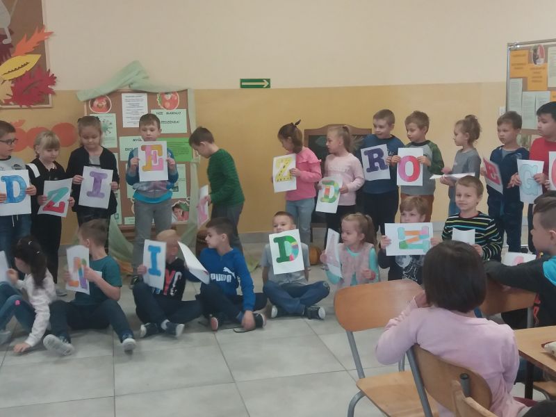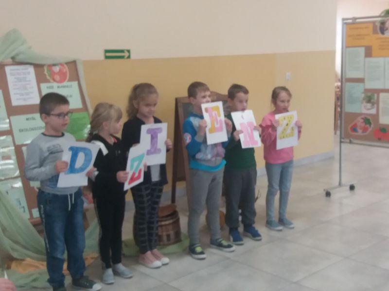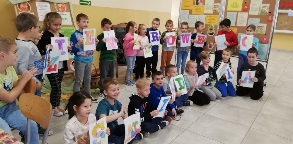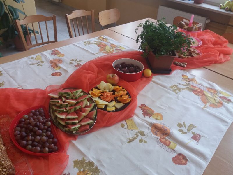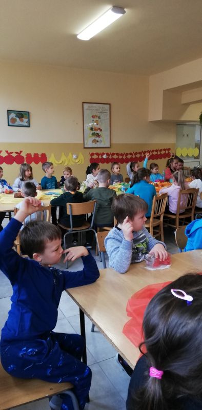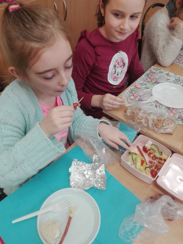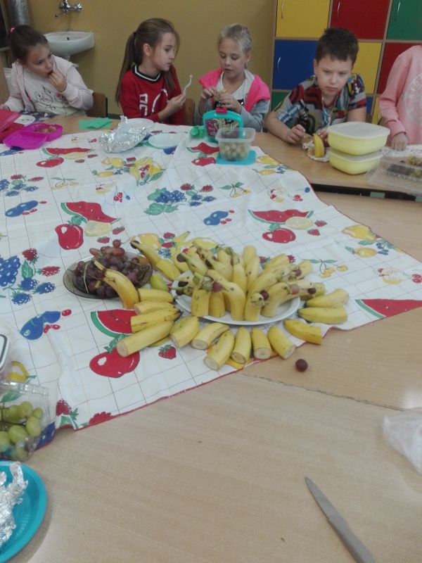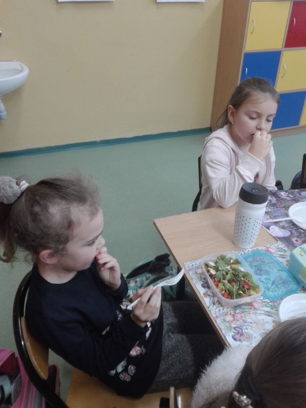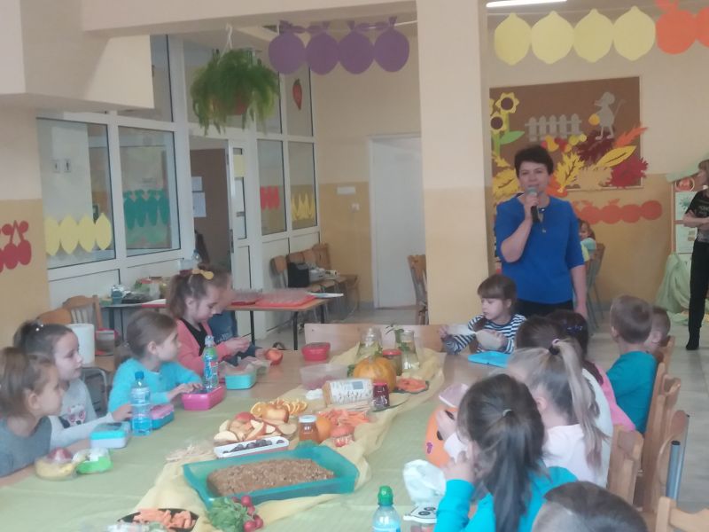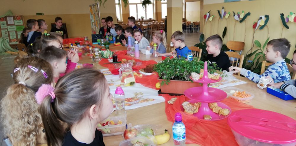 Ósmego listopada wszyscy uczniowie klas pierwszych zostali zaproszeni przez wychowawców i dzieci ze świetlicy szkolnej na uroczyste zdrowe śniadanie do stołówki szkolnej. Przy pięknie nakrytych stołach ze zdrową żywnością uczniowie zjedli ze swoimi wychowawcami zdrowe kanapki, warzywa, owoce, sałatki przygotowane przez rodziców. Spotkanie było okazją do wspólnej rozmowy, zabawy i rozwiązywania zagadek o zdrowym odżywianiu. Wiedza dzieci na ten temat pozytywnie nas zaskoczyła, wykazały się znajomością nazw warzyw i owoców, nawet tych egzotycznych. Ważnym aspektem spotkania był także problem marnowania żywności, o którym informowała nas zrobiona wystawka. W czasie śniadania towarzyszyła nam muzyka – piosenki o zdrowym odżywianiu.