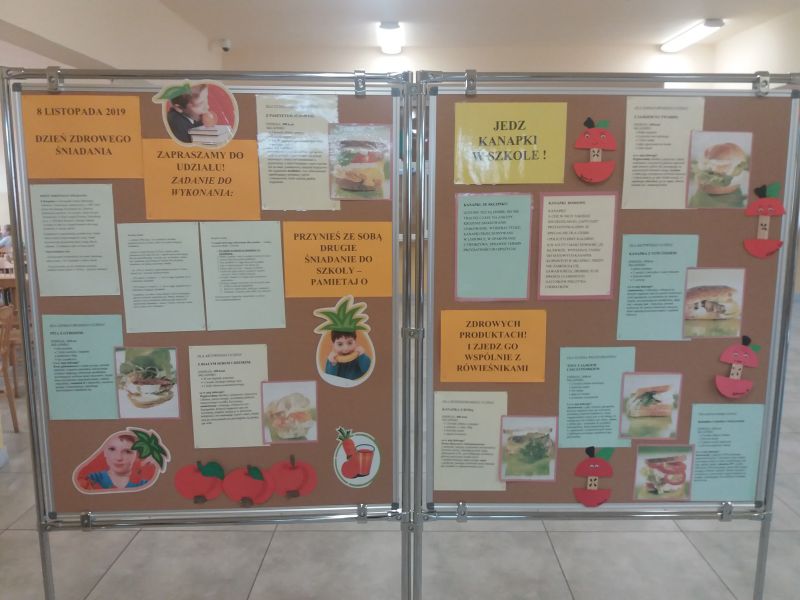 Aby wypromować zdrowy styl życia wśród dzieci i młodzieży, w dniu 8 listopada społeczność naszej szkoły włączyła się w europejskie obchody Dnia Zdrowego Śniadania. W ramach przygotowań do tego dnia dzień wcześniej nadano komunikat przez radiowęzeł szkolny, przygotowano wystawkę promującą ideę spożywania zdrowego drugiego śniadania w szkole oraz przygotowano dekorację stołówki szkolnej.