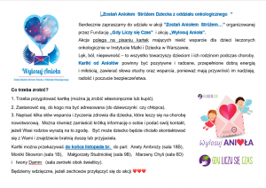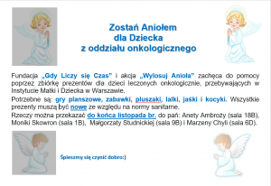 Serdecznie zapraszamy wszystkich członków społeczności szkolnej do udziału w akcjach „Zostań Aniołem dla Dziecka z oddziału onkologicznego” oraz „Zostań Aniołem Stróżem Dziecka z oddziału onkologicznego”, które prowadzone są na rzecz dzieci leczonych w Instytucie Matki i Dziecka w Warszawie. Liczymy na Wasze wsparcie i gorące serca 🙂