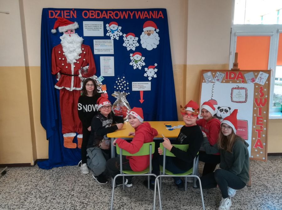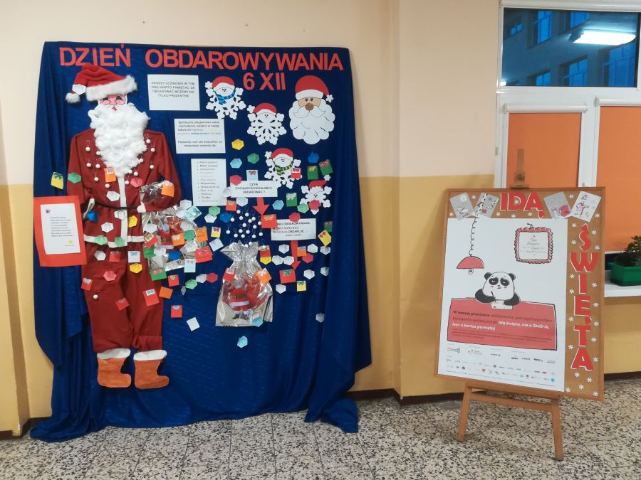 Na holu głównym szkoły pojawiła się postać Mikołaja, obok której uczniowie mogli przypinać odpowiedzi na pytanie: Kogo i czym chciałabym/chciałbym obdarować?