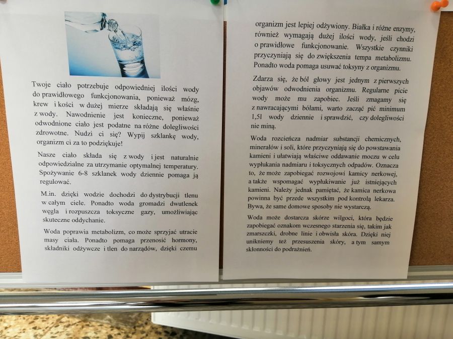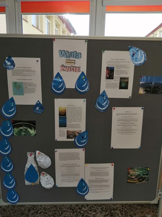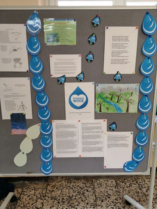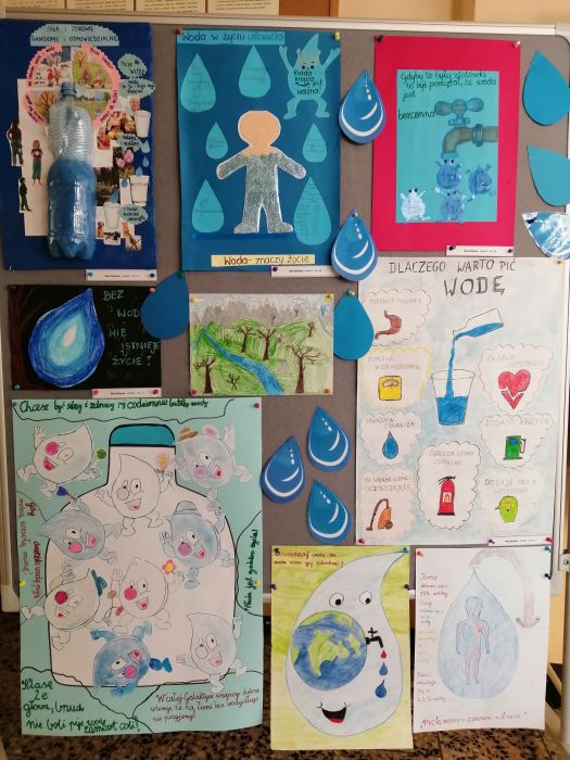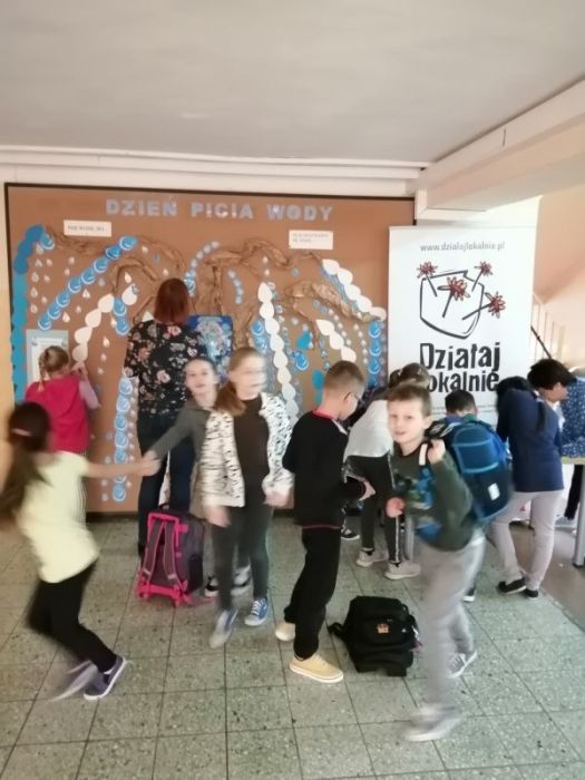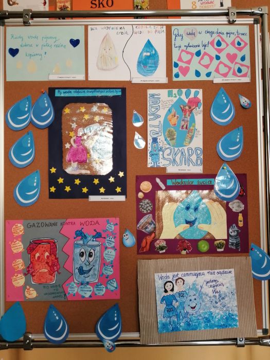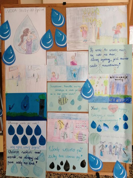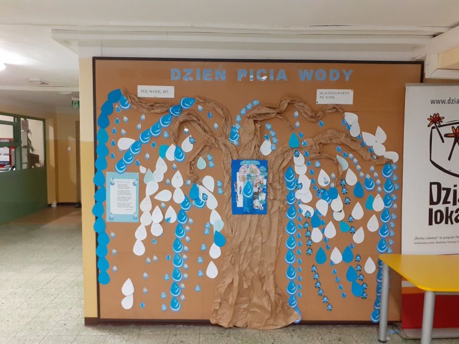 3 grudnia w naszej szkole obchodziliśmy Dzień picia wody. Wydarzenie to miało na celu propagowanie wśród społeczności szkolnej nawyku picia wody, która jest niezbędnym elementem regulującym prawidłową pracę naszego organizmu. Działanie to jest jednym z zapisanych oddziaływań w Programie wychowawczym szkoły. Z okazji tego dnia drzewo znajdujące się na tablicy na holu głównym zostało ozdobione w kropelki wody, na których nasi uczniowie mogli wpisywać odpowiedzi na kluczowe pytania akcji: Dlaczego warto pić wodę? i Piję wodę, bo…