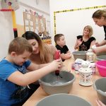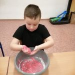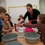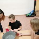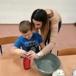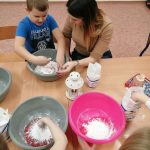 Celem organizowanych zajęć było rozwijanie sfery sensorycznej – wzroku, słuchu, węchu, smaku i dotyku. Poznając zapachy świąteczne – goździków, cynamonu czy pieczonych jabłek, uczniowie oswajali się z nimi. Poprzez kontakt z materiałami sypkimi, płynnymi i lepkimi – poszerzali świat własnych doznań, przyzwyczajali się do nowych faktur i konsystencji, świetnie się przy tym bawiąc. Wykonując kolejne zadania, uczestnicy zajęć rozwijali twórcze działania, usprawniali motorykę małą, uczyli się współpracy.
