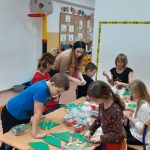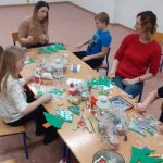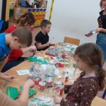 Niezwykle ważnym elementem zajęć było również uwrażliwienie dzieci na moc obdarowywania, tak ważną w tym szczególnym okresie. Dzieciaki samodzielnie wykonywały aromatyczne kule do kąpieli, które później ozdabiały i własnoręcznie pakowały w folie prezentowe. Wraz z rodzicami stworzyły również przepiękne prace plastyczne, które polegały na dekorowaniu szablonów choinek. Wykorzystując różnorodne materiały ozdobne, takie jak np. sztuczny śnieg, brokat, cekiny, guziki czy koraliki, powstały małe dzieła sztuki, które zdobią hol główny szkoły.