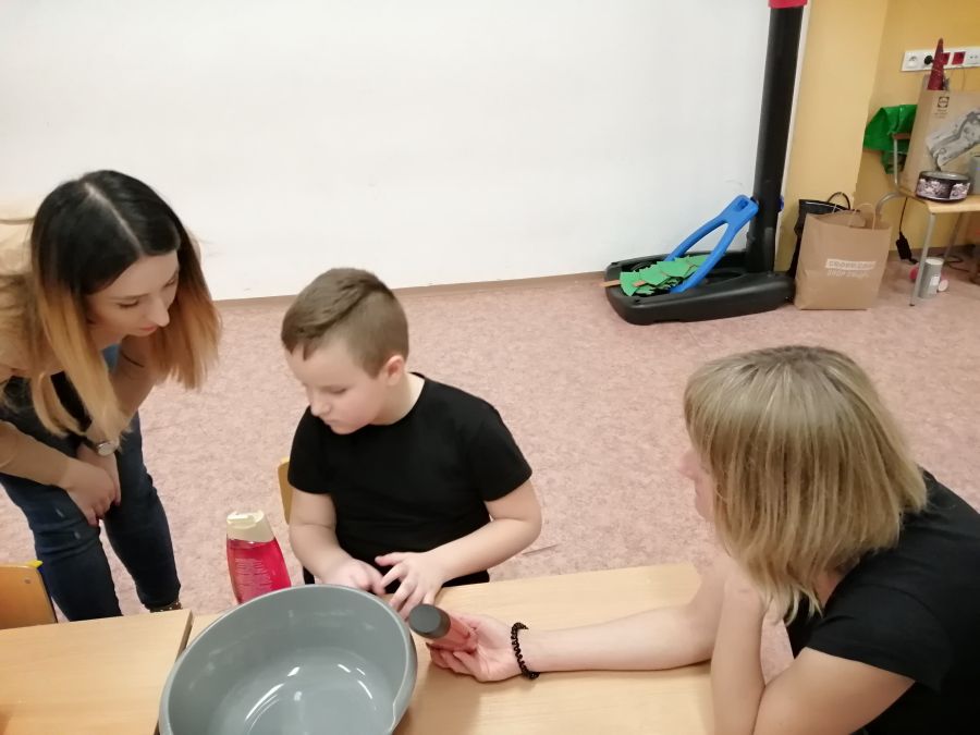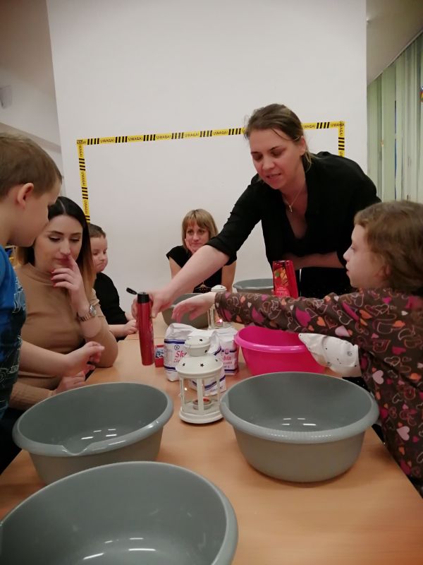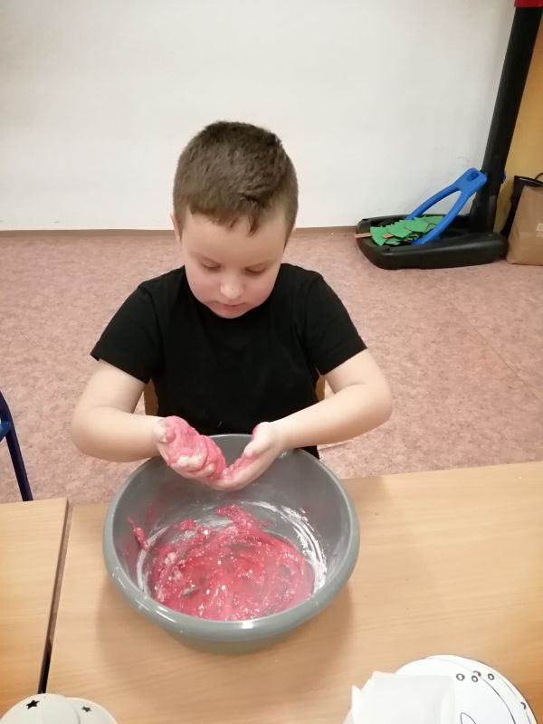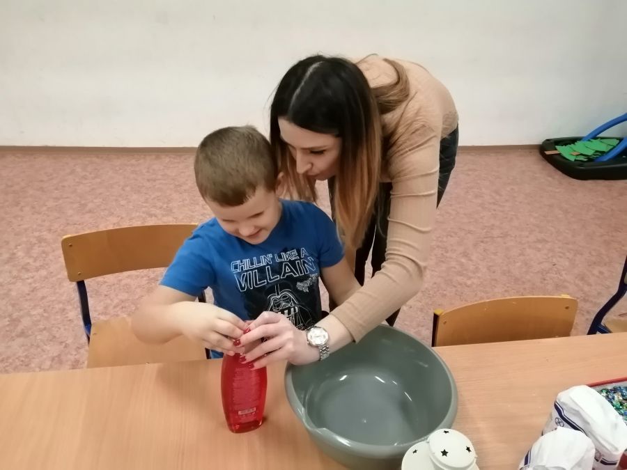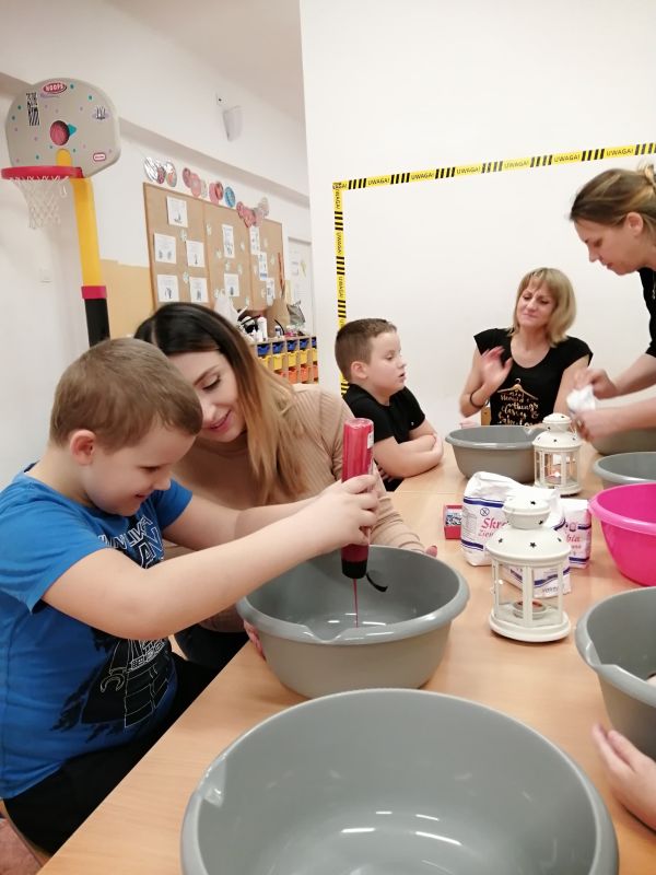 Celem organizowanych zajęć było rozwijanie sfery sensorycznej – wzroku, słuchu, węchu, smaku i dotyku. Poznając zapachy świąteczne – goździków, cynamonu czy pieczonych jabłek, uczniowie oswajali się z nimi. Poprzez kontakt z materiałami sypkimi, płynnymi i lepkimi – poszerzali świat własnych doznań, przyzwyczajali się do nowych faktur i konsystencji, świetnie się przy tym bawiąc. Wykonując kolejne zadania, uczestnicy zajęć rozwijali twórcze działania, usprawniali motorykę małą, uczyli się współpracy.