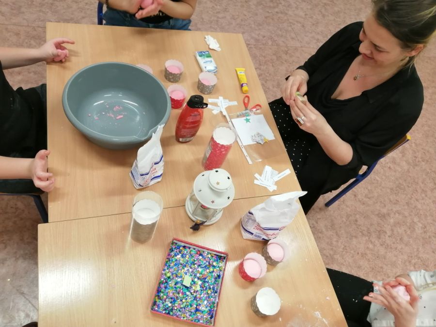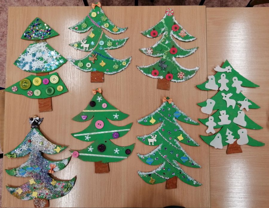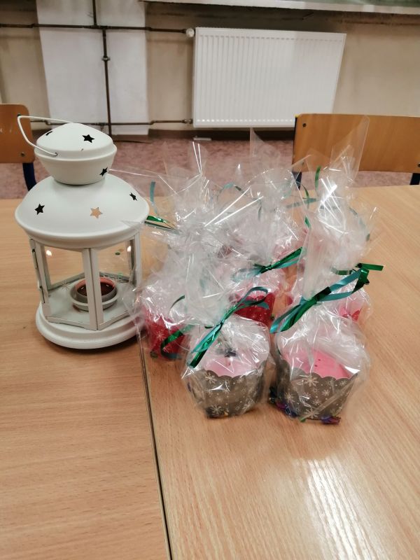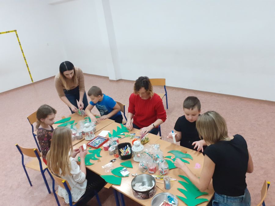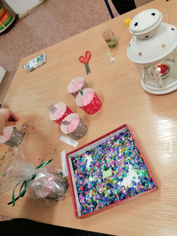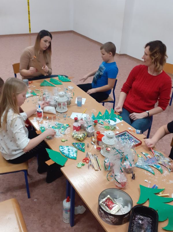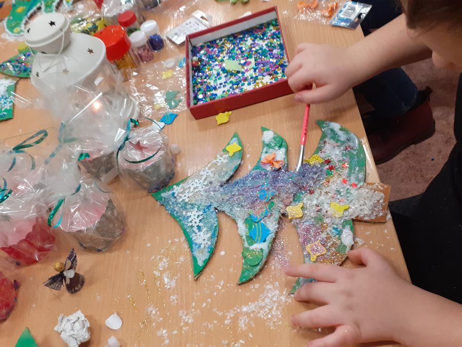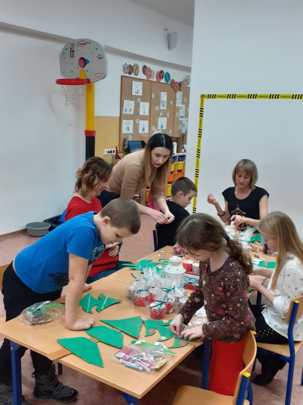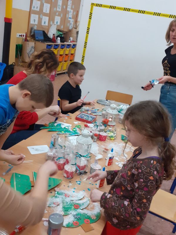 Niezwykle ważnym elementem zajęć było również uwrażliwienie dzieci na moc obdarowywania, tak ważną w tym szczególnym okresie. Dzieciaki samodzielnie wykonywały aromatyczne kule do kąpieli, które później ozdabiały i własnoręcznie pakowały w folie prezentowe. Wraz z rodzicami stworzyły również przepiękne prace plastyczne, które polegały na dekorowaniu szablonów choinek. Wykorzystując różnorodne materiały ozdobne, takie jak np. sztuczny śnieg, brokat, cekiny, guziki czy koraliki, powstały małe dzieła sztuki, które zdobią hol główny szkoły.