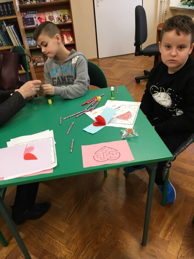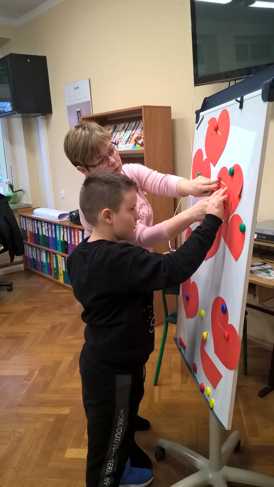 Dzieci wykonywały kartkę dla przyjaciela z miłym przekazem, składały serduszka z puzzli, rozmawiały o cechach dobrego przyjaciela, o tym, w jaki sposób okazujemy uczucia i jak ważne są one w naszym życiu.