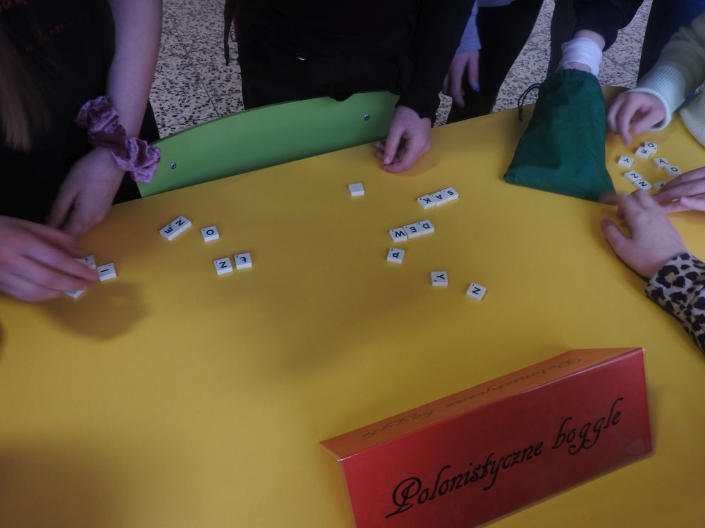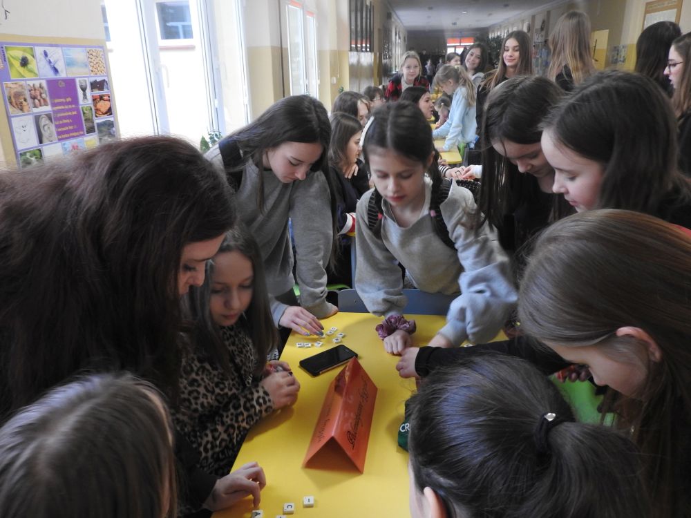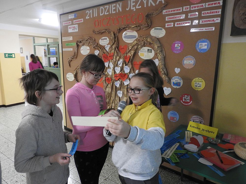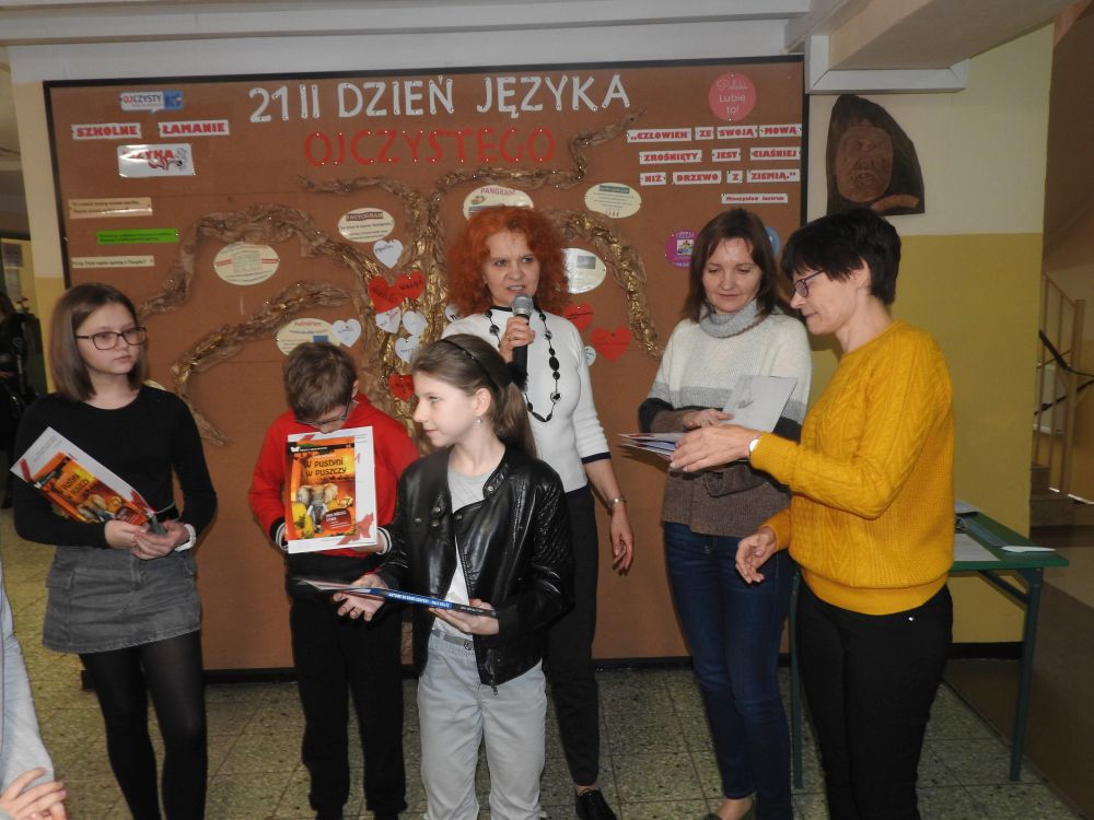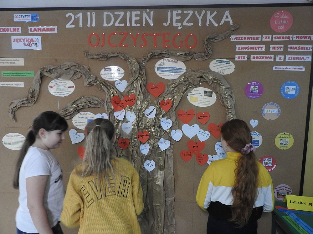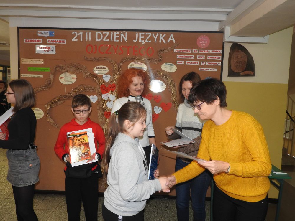 Podczas długich przerw w holu głównym szkoły uczniów i nauczycieli zaproszono do udziału w zabawach językowych pod hasłem: „Polski? Lubię to!”. Królowały „Polonistyczne memory”, „Polonistyczne boogle” i łamańce językowe, a drzewo na gazetce ozdobiły białe i czerwone serduszka z trudnymi polskimi wyrazami – do zapamiętania. Nagrodzono także zwycięzców konkursu „Z polszczyzną za pan brat” – pamiątkowe dyplomy oraz nagrody książkowe wręczyły im panie Marzena Abramczuk i Dominika Mikoda, wicedyrektorki szkoły.