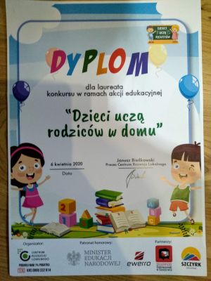 Jednym z zadań, którego podjęli się uczniowie, był konkurs na wykonanie zdjęć podczas pracy wspólnie z Rodzicami w domu. Wśród wielu prac nadesłanych z całej Polski nagrodzono 3 nasze uczennice z klasy 2 e: Maję Nalepę, Lily Piotrowską i Karolinę Walczyk.
