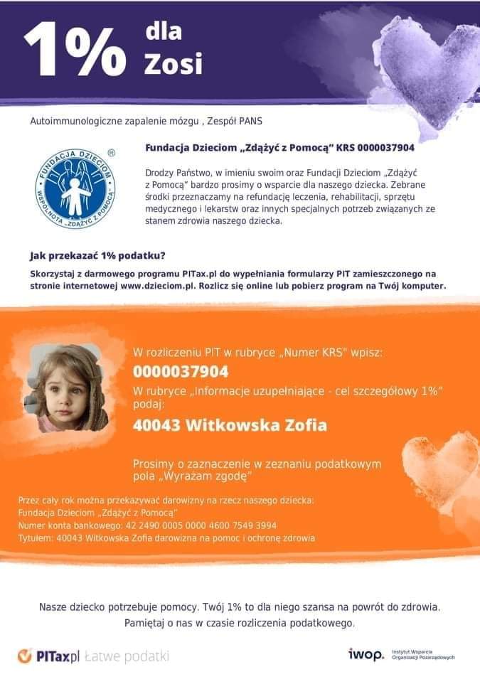 Witajcie Kochani, przed nami tydzień świąteczny, Boże Narodzenie zbliża się wielkimi krokami jednak nie wszystkie dzieci będą mogły spędzić dni w swoim rodzinnym domu ze swoimi bliskimi, chcę Was poprosić o pomoc dla chorej Zosi, która potrzebuje wsparcia finansowego, liczę na Waszą pomoc. Szczegóły w załącznikach poniżej. Pozdrawiam i życzę zdrowia! Proszę także o rozesłanie linków.