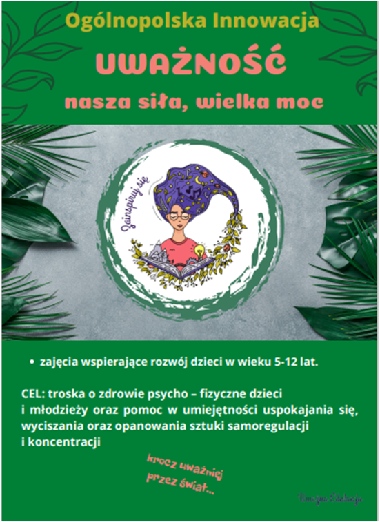 W roku szkolnym 2022/2023 klasa 1b weźmie udział w ogólnopolskiej innowacji programowo – metodycznej – „UWAŻNOŚĆ – nasza siła, wielka moc”. Bazuje ona na założeniach Jona Kabat – Zinna, twórcy najpopularniejszego, 8-tygodniowego modelu pracy z uważnością – MBSR (Mindfulness Based Stress Reduction). Uważność to kompleksowe narzędzie do rozwijania i stymulowania zmysłów, usprawnienia procesu zapamiętywania i budowania motywacji oraz pozytywnego nastawienia do nauki.