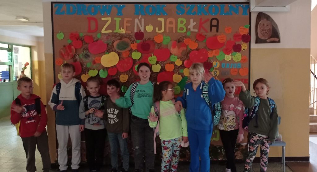 Uczniowie klasy II „A” wraz z nauczycielami Katarzyną Chrząstowską- Chabior i Anetą Ambroży, 28 września – obchodziły zielono-czerwono-żółty dzień. Dzieci miały okazję zapoznać się z prezentacją multimedialną “Światowy Dzień Jabłka” i przygotowały klasową książkę kulinarną “Jabłkowe Przepisy”. Odwiedziły szkolną kuchnię, gdzie degustowały różne odmiany jabłek. Wykonały prace plastyczne „Kolorowe jabłuszka – mandale” oraz czerwone jabłuszka z pasków, które można było podziwiać na wystawie na segmencie D oraz w holu głównym szkoły, gdzie przygotowały również gazetkę tematyczną. Dzień zakończyły zabawami muzyczno-ruchowymi z chustą animacyjną.