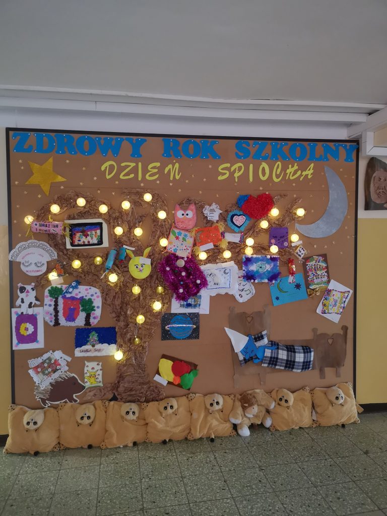 pt. „Zaprojektuj swoją poduszkę – jaśka”. Prace uczniów były bardzo pomysłowe i wykonane z niezwykłą starannością. Pod drzewem na łóżku wylegiwał się smerf Śpioch. Magię nocy podkreśliły świecące kule przyczepione do gałęzi drzewa oraz rozmieszczone światełka na holu głównym. Na szybach okiennych pojawiły się gwiazdy i księżyce, a na parapetach stały lampy nocne, poduszki oraz przytulanki. Znalazło się również miejsce relaksu, gdzie uczniowie na miękkich pufach mogli się odprężyć. Wspaniała dekoracja przygotowana została również na korytarzu stołówki szkolnej.