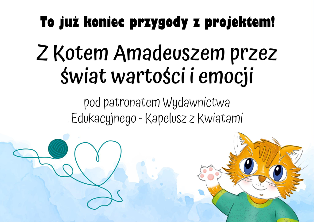 Klasa 1c zakończyła właśnie przygodę z projektem „Z kotem Amadeuszem przez świat wartości i emocji” pod patronatem wydawnictwa edukacyjnego Kapelusz z Kwiatami! Choć to koniec spotkań uczniów z przesympatycznym kocim łobuziakiem Amadeuszem, to z pewnością korzyści z nich płynące pozostaną z dziećmi na zawsze.  Poprzez przygody i perypetie bohatera projektu, uczniowie mogli utożsamić się z przeżywanymi przez niego emocjami, problemami i trudnościami. Wspólnie staraliśmy się szukać rozwiązań i możliwości wyjaśnienia tego, co niejasne, trudne i skomplikowane. Uczyliśmy się, jak radzić sobie z trudnymi emocjami oraz różnymi sytuacjami dnia codziennego. Czas poświęcony na realizację zajęć, to czas zdobywania wiedzy i cennych umiejętności. Jednak oprócz tych oczywistych korzyści, nie sposób nie wspomnieć, że zajęcia w ramach projektu były dla uczniów również doskonałą okazją do wzajemnego poznawania się, zacieśniania relacji oraz dobrej zabawy!