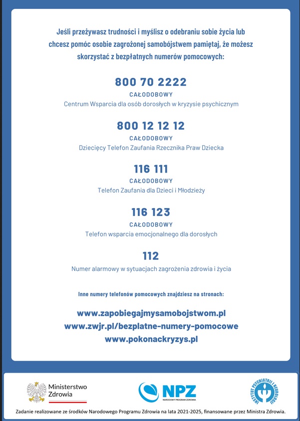 Załączone telefony gwarantują szybki dostęp do informacji i wsparcia, jak również podejmowanie interwencji w sprawach ważnych z punktu widzenia zdrowia psychicznego i bezpieczeństwa dzieci oraz młodzieży.