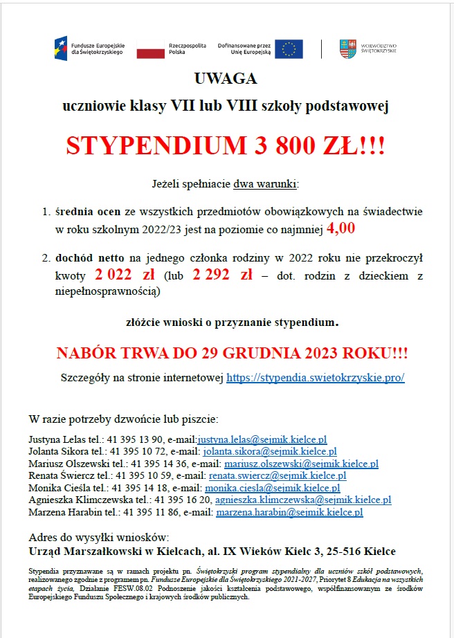 Informacjia o II naborze wniosków o przyznanie stypendiów dla uczniów klas VII i VIII szkół podstawowych, w ramach Świętokrzyskiego programu stypendialnego dla uczniów szkół podstawowych.