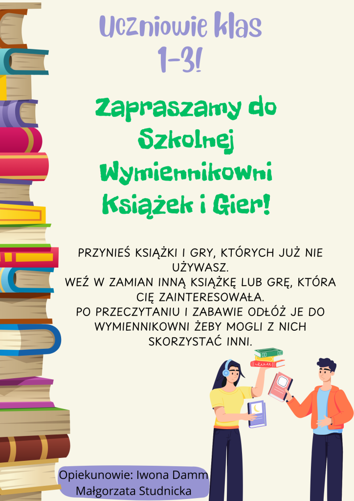 - Wymiennikownia jest dostępna dla wszystkich uczniów klas 1-3 i ich rodziców.
