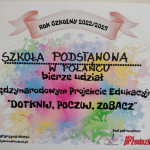 W roku szkolnym 2022/2023 Szkoła Podstawowa w Połańcu bierze udział w fascynującym Międzynarodowym Projekcie Edukacyjnym „DOTKNIJ, POCZUJ, ZOBACZ”, do którego przystąpili uczniowie pięciu państw: Polski,...